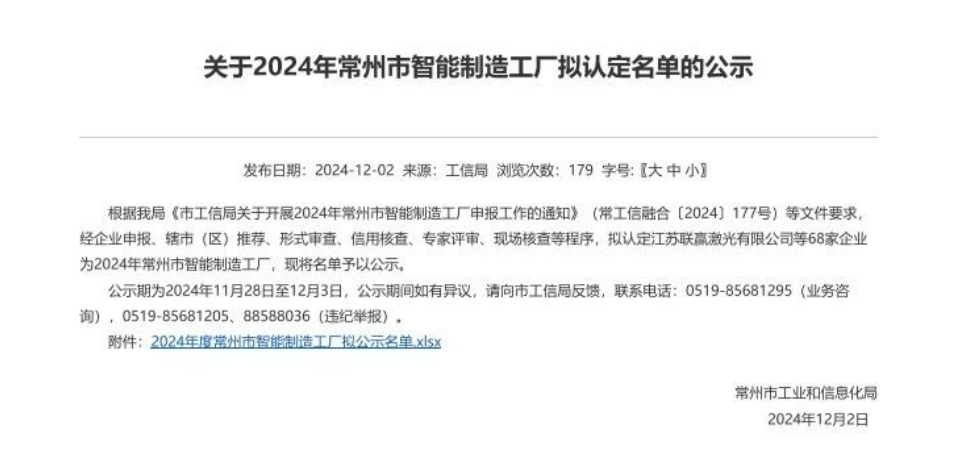 Changzhou Bureau of Industry and Information Technology released the 2024 Changzhou Smart Manufacturing plant to be recognized list, Changzhou HWE on the list!